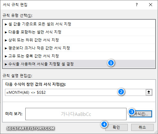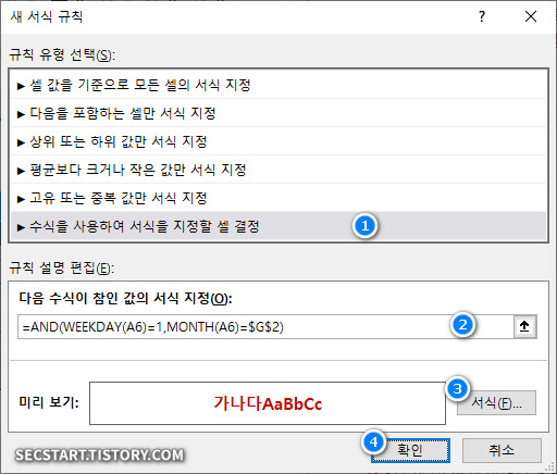 [첫번째 조건] 요일이 1(일요일) 이고, [두번째 조건] 이번달 이라면 '진한 빨강' 에 '굵게' 서식을 지정