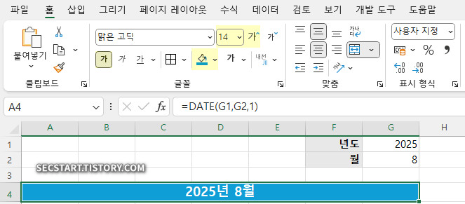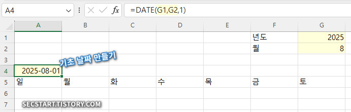 이 함수는 G1년 G2월의 첫째 날을 자동으로 계산해줘요. 예를 들어 G1이 2025, G2가 8이면 2025년 8월 1일이 결과로 나오죠.