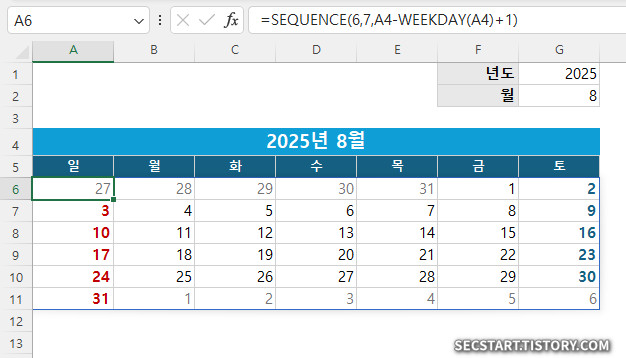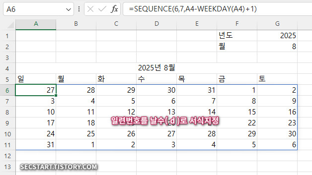 🎯 [핵심 요약] DATE 함수로 기준날짜 생성 → SEQUENCE 함수로 6주×7일 자동 배치 → 조건부 서식으로 스타일링