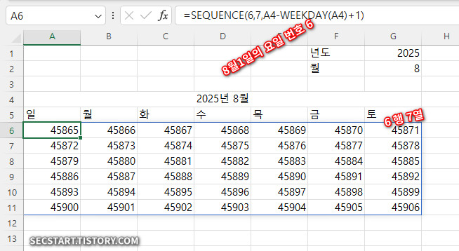 - A4-WEEKDAY(A4)+1: ( =45870-6+1 ) 해당 월의 첫째 주의 일요일 날짜를 계산해요, 이 값을 SEQUENCE 함수 시작값으로 합니다.