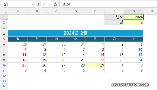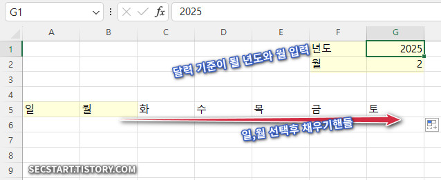 - G1 셀: 원하는 년도 입력 (예: 2025)