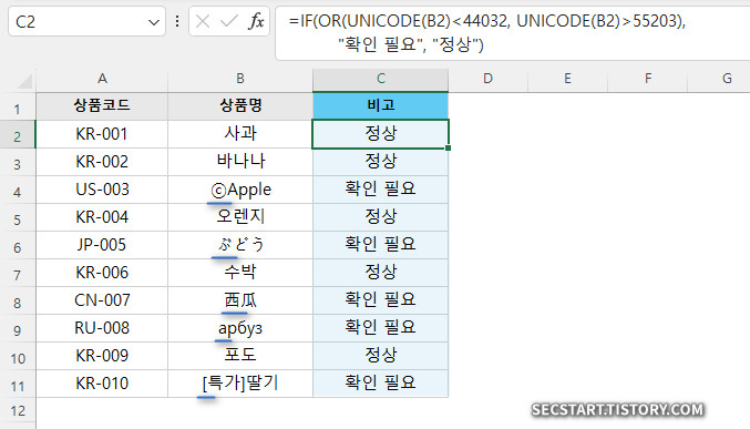 상품명의 첫 글자가 한글 범위를 벗어나는 'ⓒApple', 'ぶどう', '西瓜', 'арбуз', '[특가]딸기' 행에 "확인 필요" 라는 메시지가 정확히 표시되는 것을 볼 수 있습니다. 데이터 검수할 때 정말 유용하겠죠?