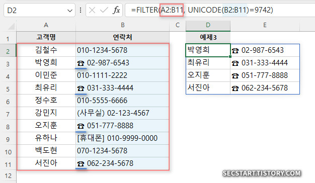 연락처 맨 앞에 전화 기호(☎)가 있는 박영희, 최유리, 오지훈, 서진아 고객의 데이터만 완벽하게 필터링해서 보여줍니다. LEFT 함수로 연락처의 첫 글자를 가져오고( UNICODE 함수는 첫글자만 처리하기에 LEFT 생략해도 동일 ), 그 첫 글자의 UNICODE 값이 9742인지를 판단하는 원리예요.