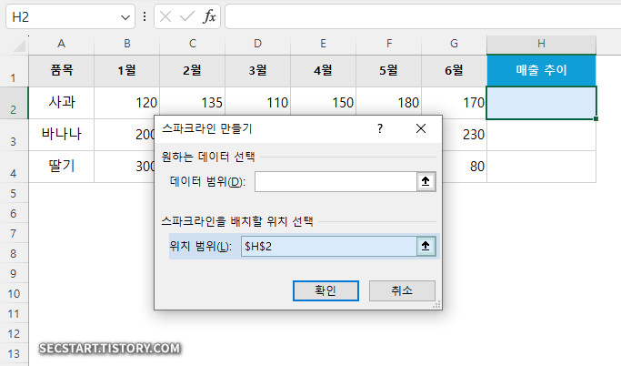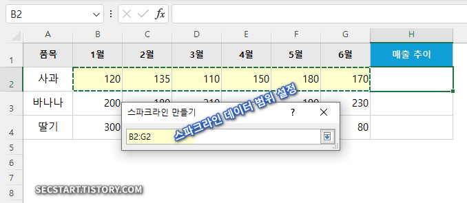 - '데이터 범위(D)' 칸에 '사과'의 1월부터 6월까지의 매출 데이터 범위인 B2:G2를 마우스로 쭉~ 드래그해서 선택해주세요.