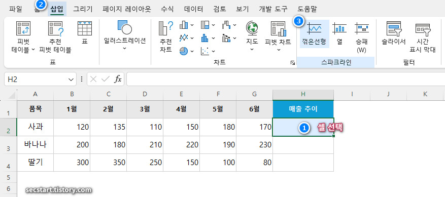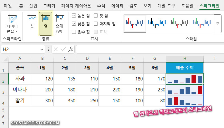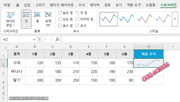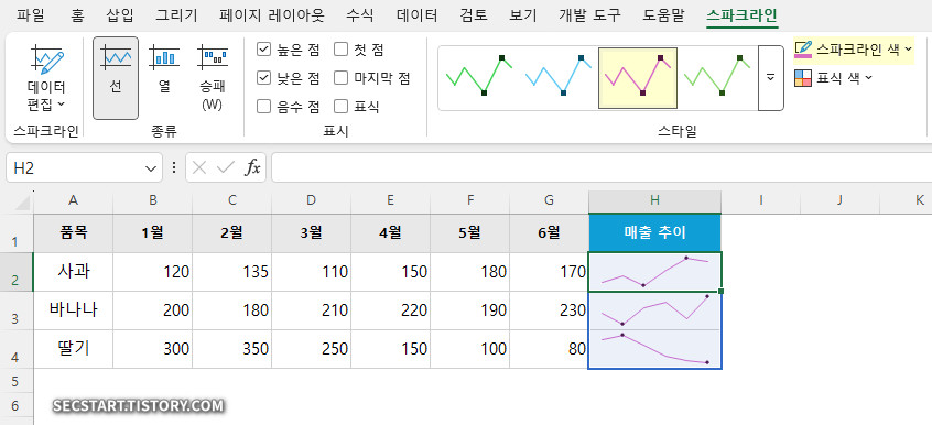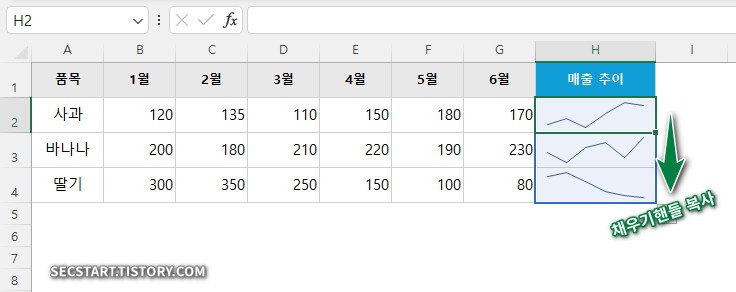 어때요? H2셀에 '사과' 매출의 오르내림을 보여주는 작은 그래프가 생겼죠? 정말 간단하지 않나요? 🥳