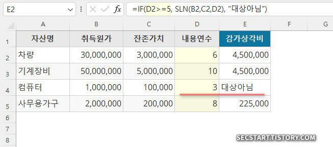 =IF(D2>=5, SLN(B2,C2,D2), "대상아님")
