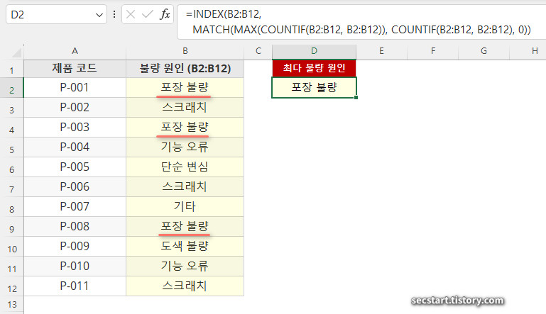 자, 이 데이터에서 가장 자주 발생한 불량 원인을 찾아봅시다! 결과를 표시할 셀에 아래 수식을 입력해 보세요.