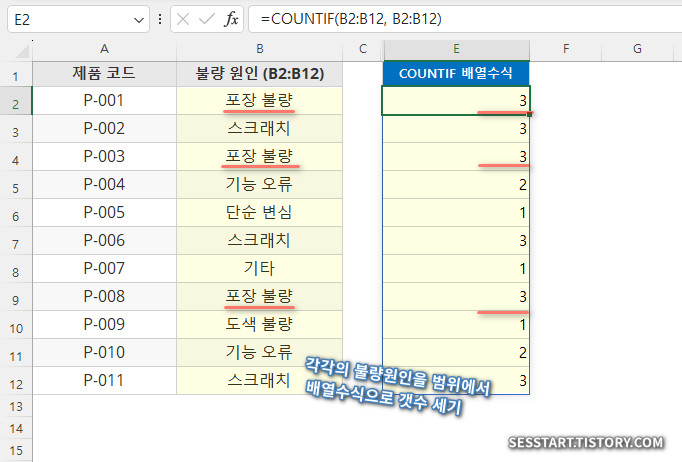 - 작동 원리: 배열 수식으로 사용되면, A2셀의 '사과' 가 전체(A2:A10)에서 몇 개인지, A3셀의 '바나나' 가 몇 개인지... 이렇게 각 셀마다의 빈도를 계산해서 메모리에 가상의 배열(숫자 목록)을 만듭니다.