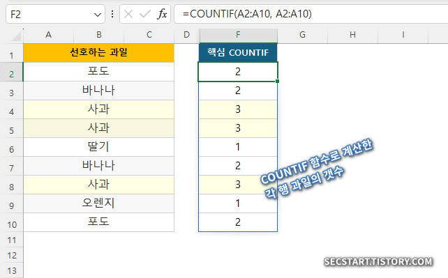 - 역할: 각 과일이 전체 목록에서 몇 번씩 등장하는지 COUNTIF 함수로 개수를 셉니다.