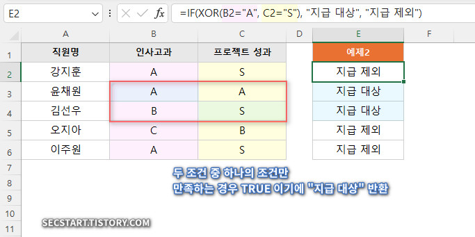 =IF(XOR(B2="A", C2="S"), "지급 대상", "지급 제외")