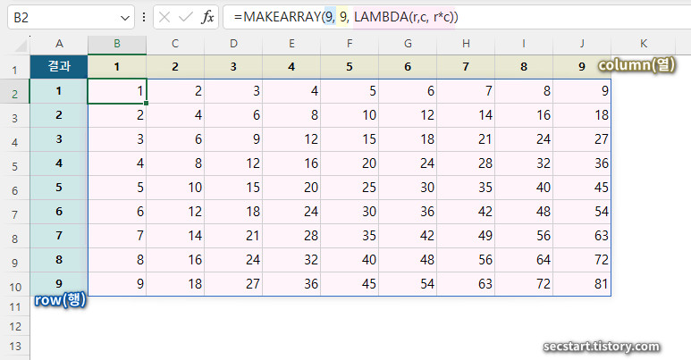 가장 기본적인 예제로 9x9 구구단 표를 만들어 볼게요. MAKEARRAY를 쓰면 순식간에 만들 수 있답니다.
