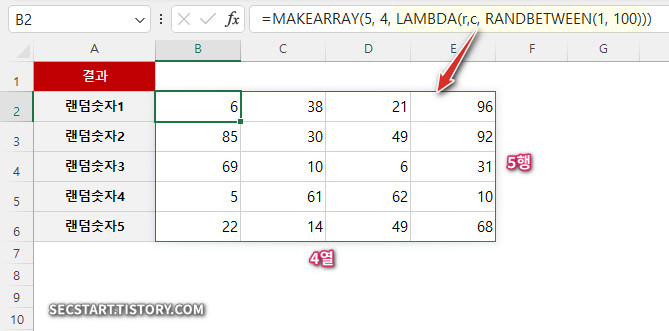 이번엔 RANDBETWEEN 함수와 함께 사용하여 지정된 범위 내의 랜덤 숫자로 배열을 채워볼게요. 보고서에 쓸 샘플 데이터 만들 때 정말 유용해요!