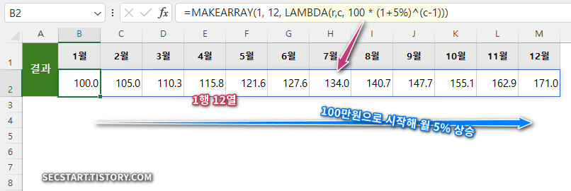 실무에서 바로 써먹을 수 있는 예제예요. 처음 매출액이 100만원, 매월 5%씩 성장하는 예상 매출표를 MAKEARRAY 함수로 만들어 보겠습니다.