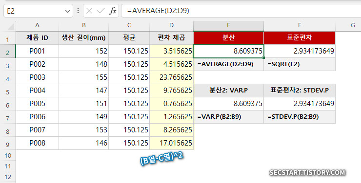 먼저 '분산'을 구해야 해요. 분산은 '편차 제곱의 평균'이랍니다. (E2 셀) 바로 분산을 구하는 함수는 VAR.P (모집단 전체 분산) 입니다.