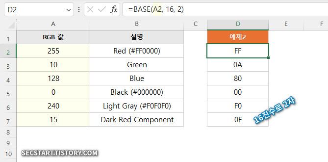 - =BASE(15, 16, 2) => 15를 16진수(최소 2자리)로 => "0F"