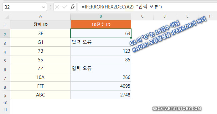 데이터 중간에 16진수가 아닌 값이 섞여 있을 경우, #NUM! 오류가 발생하는데요. IFERROR 함수를 함께 사용하면 오류 대신 "입력 오류"와 같은 특정 텍스트를 표시할 수 있습니다.