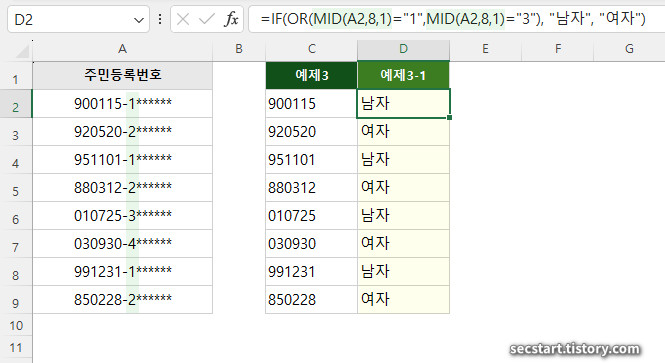 주민번호 하이픈 뒤 첫문자는 남녀를 구분하는 코드입니다. 1과 3이면 '남', 2와 4이면 '여' 를 IF 함수와 조합하여 구분할 수도 있어요.