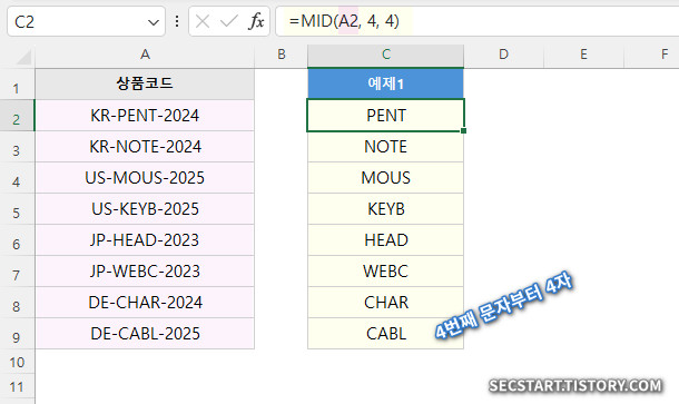 A2 셀, "KR-PENT-2024" 텍스트의 4번째 문자부터 4글자를 추출해요. "PENT" 가 결과로 반환됩니다. 이렇게 나머지 상품코드들도 중간 코드만을 추출할 수 있어요.