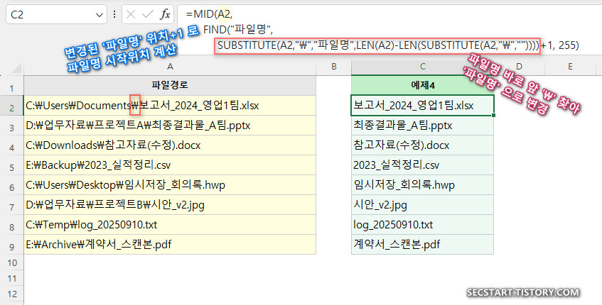 ㄴ. SUBSTITUTE(A2,"\","파일명", ...): (ㄱ.단계로 얻은) 마지막 '\' 만 "파일명" 이라는 지정 텍스트로 바꿔요.