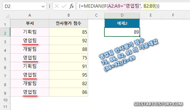 예제 2: 중급 활용 (특정 부서의 인사평가 점수 중간값 찾기 with IF)