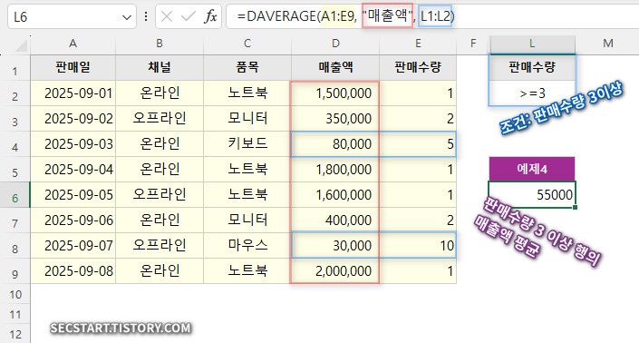 =DAVERAGE(A1:E9, 4, L1:L2) // 두번째 인수로 "매출액" 대신 범위에서 열의 위치를 숫자로 줄 수도..