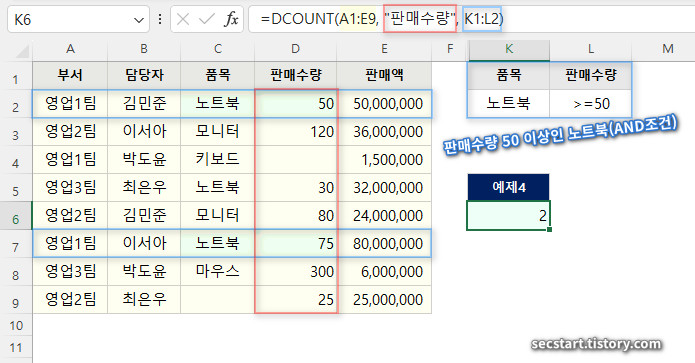 - 포인트: 판매수량은 '숫자' 데이터이므로 DCOUNT 함수를 사용해요. '박도윤' 담당자의 판매수량은 비어있으므로 계산에서 제외될 거예요.