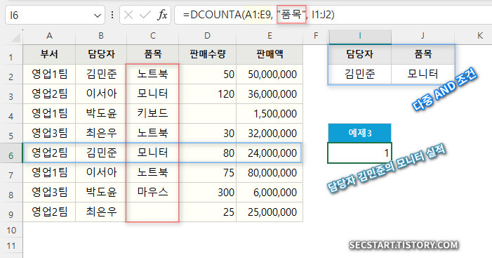전체 데이터 중 담당자가 '김민준' 이면서 동시에 품목이 '모니터 '인 데이터는 단 1건이므로 결과는 1이 나와요.