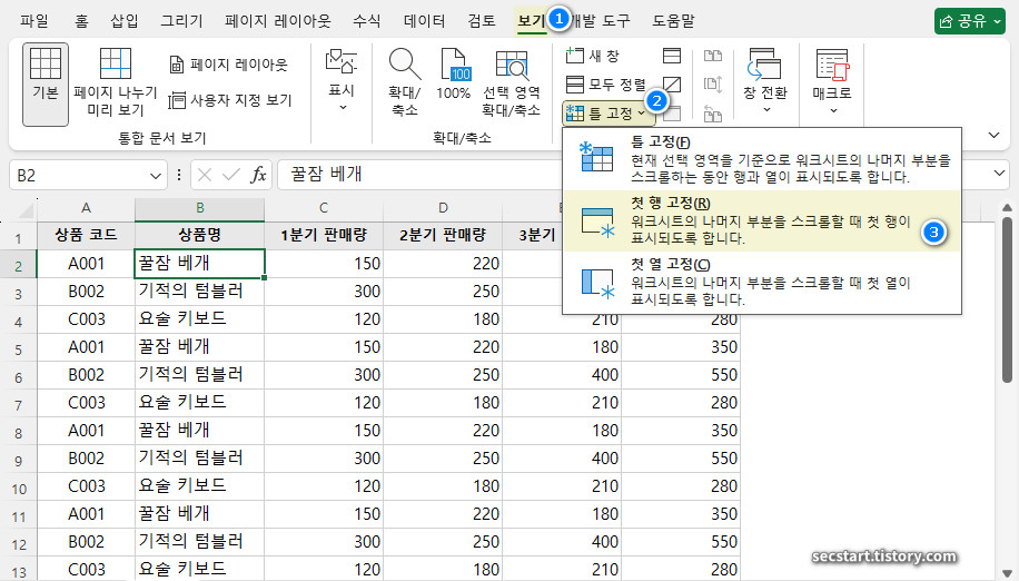 - [보기] > [틀 고정] > [첫 행 고정]