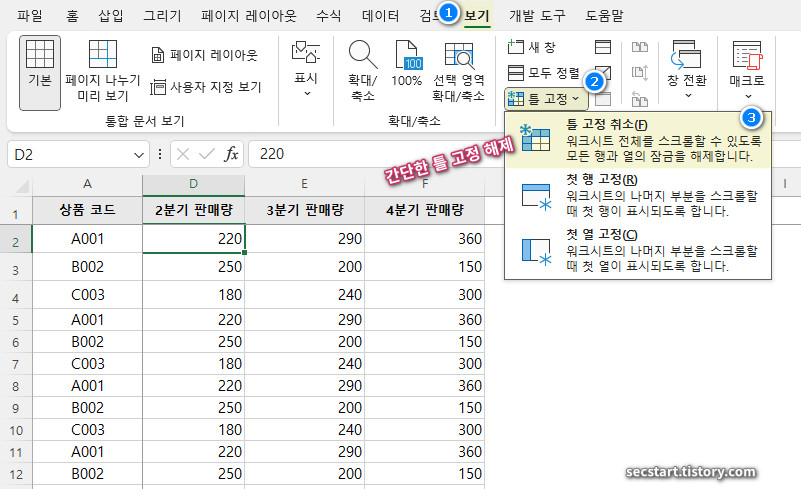 틀 고정을 해제하는 건 더 쉬워요! 언제든지 [보기] > [틀 고정]으로 다시 가서, 활성화된 [틀 고정 취소] 버튼만 눌러주면 모든 고정이 풀린답니다.