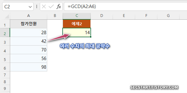 - 기본 구문: =GCD(숫자1, 숫자2, ...)