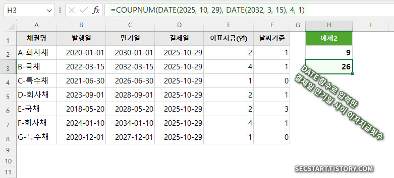 이번엔 'B-국채'의 횟수를 계산해 볼까요? 이번엔 셀 참조 대신 DATE 함수로 날짜를 직접 입력해 볼게요.
