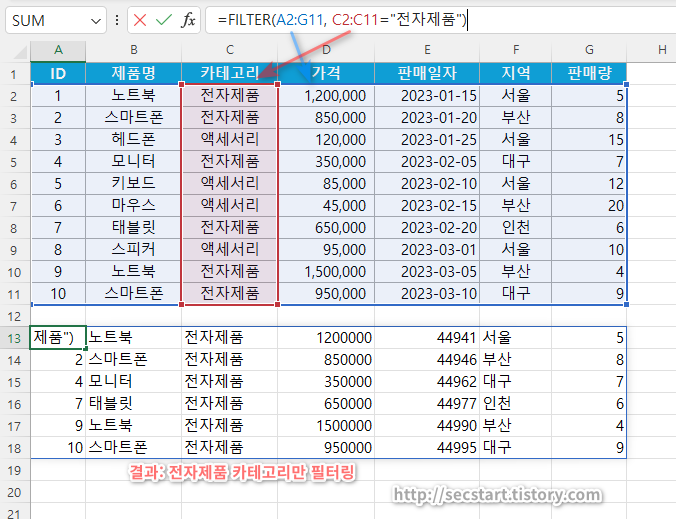 이 수식은 카테고리가 "전자제품"인 모든 행을 반환합니다.