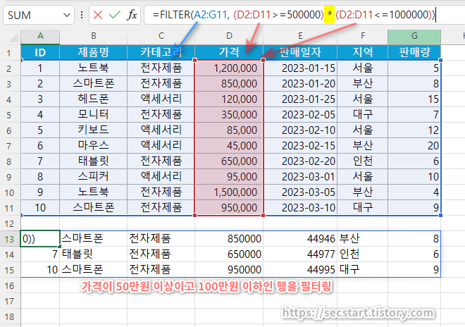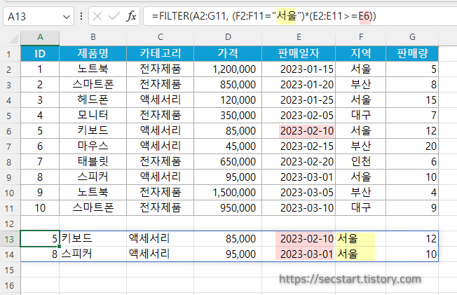 이 수식은 E2:E11 (판매일자) 가 E6 (2023/02/10) 이후이고 서울에서 판매된 모든 제품을 반환합니다.