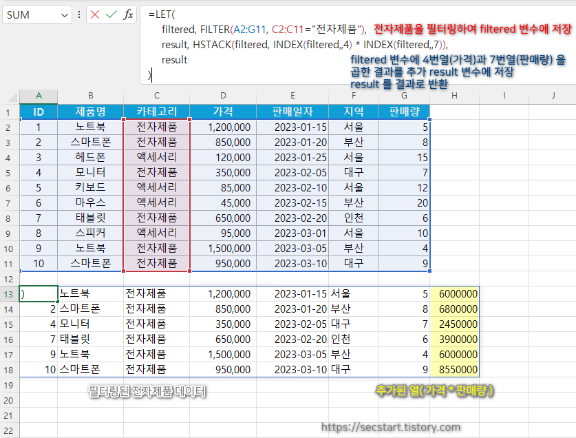 이 수식은 필터링된 결과에 총 매출액(가격 × 판매량) 열을 추가합니다.