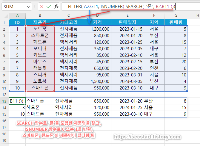 - SEARCH 함수는 '폰' 을 제품명에서 찾고, 포함되었다면 그 위치를 숫자로 반환합니다.