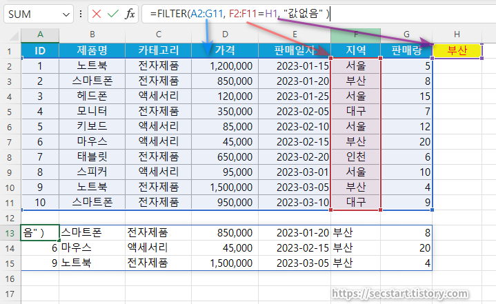 - H1 셀의 값이 다른 지역으로 바뀌면 A13 셀의 수식도 갱신되어 필터링된 결과가 달라진다.