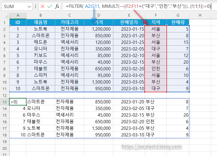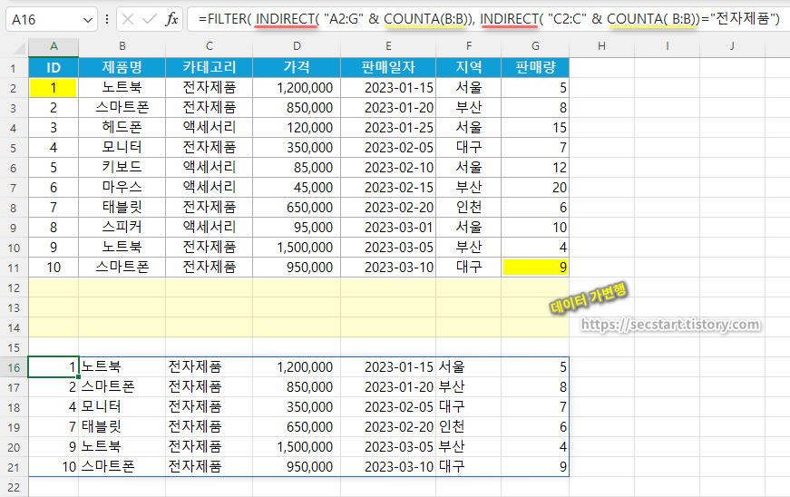 filtered, FILTER(A2:G11, C2:C11="전자제품"),