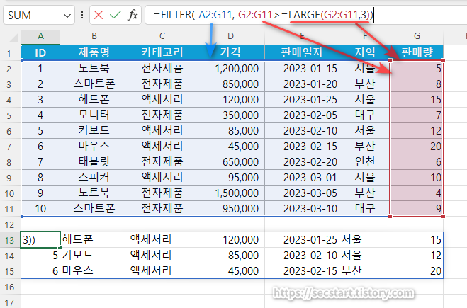 - LARGE 함수로 판매량 3번째로 큰값을 판매량과 비교 상위 3개 추출