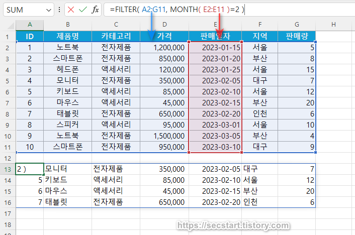 - 판매일자 범위에서 MONTH 함수로 월을 얻고 2 인 행을 반환합니다.