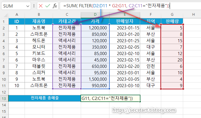 =SUM(FILTER(D2:D11*G2:G11, C2:C11="전자제품"))