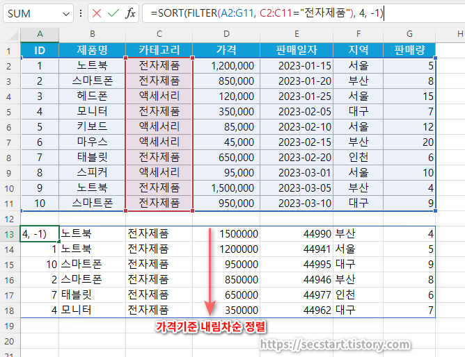 이 수식은 전자제품만 필터링한 다음 가격(4번째 열)을 기준으로 내림차순(-1) 정렬합니다.