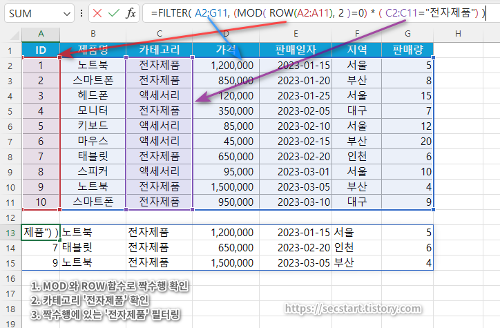 =FILTER(A2:G11, (MOD(ROW(A2:A11),2)=0)*(C2:C11="전자제품"))