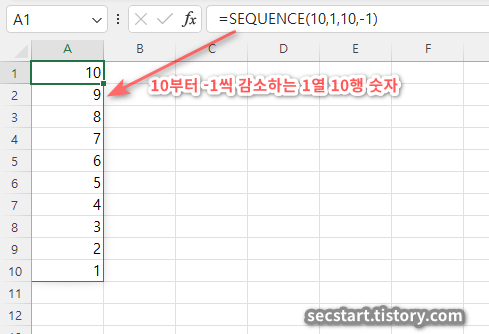 이 수식은 10, 9, 8, ... 1까지 감소하는 숫자를 생성합니다. 증분 값을 -1로 설정하면 감소하는 패턴을 만들 수 있어요.