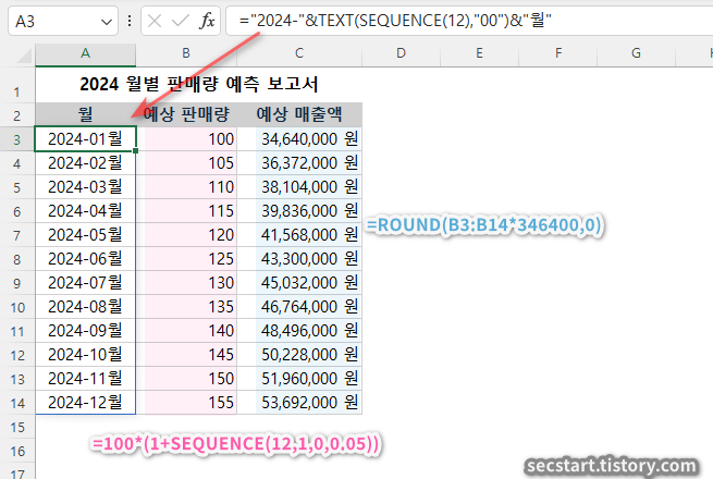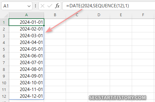 이 수식은 2024-01-01부터 2024-12-01까지 매월 1일의 날짜를 생성합니다. 판매 데이터 분석에 유용하게 활용할 수 있어요.