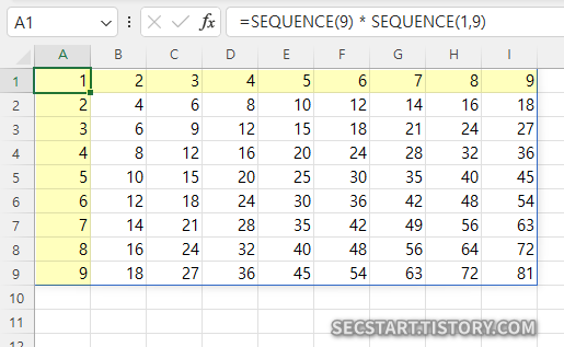 이 수식은 9×9 크기의 구구단 표를 자동으로 생성합니다. 행에는 1~9, 열에도 1~9가 곱해져서 표시되요.