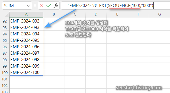 여기서 TEXT(SEQUENCE(100),"000") 부분은 1~100까지의 숫자를 001, 002, ... 100 형식으로 변환합니다. 세 자리 숫자로 맞추기 위해 앞에 0을 채워주는 역할을 해요.