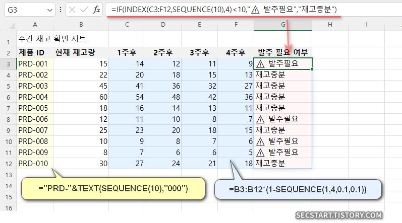 G3:G12 = IF(INDEX(C3:F12,SEQUENCE(10),4)<10,"발주필요","재고충분")