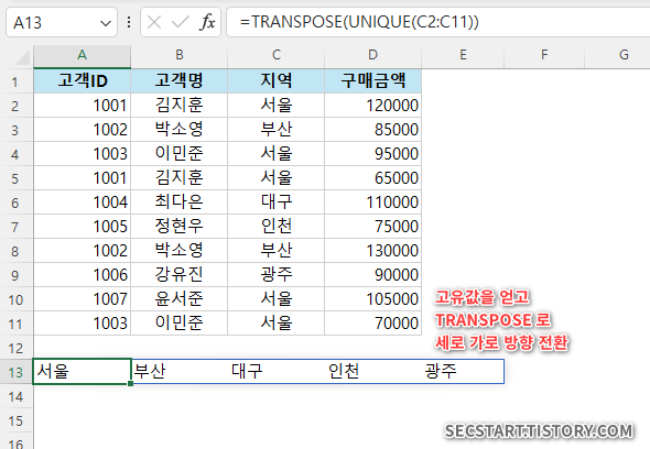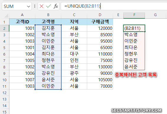 ⚠️ 노트: UNIQUE 함수는 Microsoft 365 구독이나 Excel 2021 이상 버전에서만 사용 가능합니다. 이전 버전에서는 동작하지 않으니 주의하세요.