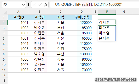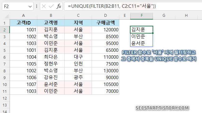 =UNIQUE(FILTER(B2:B11, C2:C11="서울"))