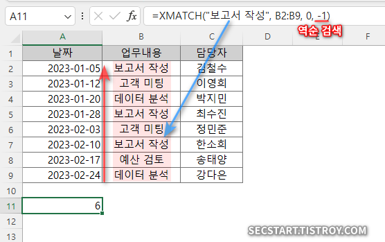 =XMATCH("보고서 작성", B2:B9, 0, -1)